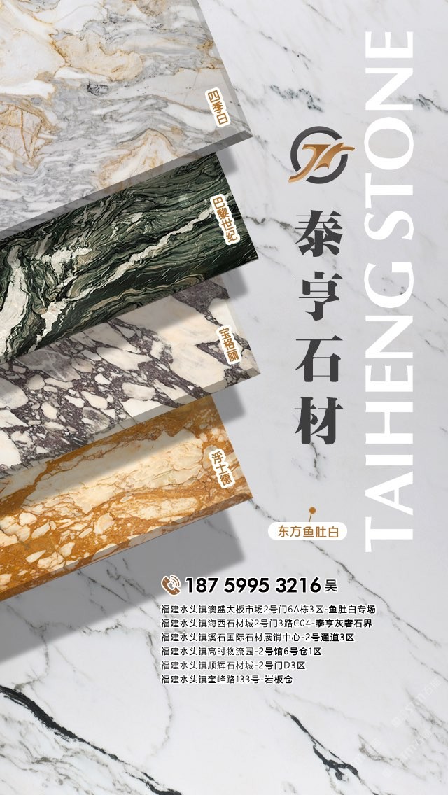 泉州泰亨石材有限公司,辦公地點(diǎn)位于中國石材之都—南安水頭。經(jīng)營產(chǎn)品有:東方魚肚白(自有礦山),四季白,巴黎世紀(jì),寶格麗,浮士德,布達(dá)拉灰(自有礦山),星空灰(自有礦山)、雅蘭云天(包礦)、蘋果灰(包礦)、銀鉆咖啡(包礦)、魚肚白、雪花白、藍(lán)金沙白金沙系列、帕斯高灰、意大利木紋、意大利,西班牙原裝進(jìn)口巖板(中國總代理)、國產(chǎn)巖板(福建總代理)、黃斑石、意大利木紋、銀鉆咖啡,魚肚灰等優(yōu)質(zhì)品種。我們以經(jīng)驗(yàn)豐富的采購團(tuán)隊(duì),熱情專業(yè)的銷售團(tuán)隊(duì)和執(zhí)著細(xì)致的技術(shù)團(tuán)隊(duì),為客戶提供精致的產(chǎn)品,售前售后服務(wù)和技術(shù)支持。本著為客戶負(fù)責(zé)的態(tài)度,經(jīng)過多年的潛心經(jīng)營,泰亨石材在石材業(yè)界樹立了良好的信譽(yù)。如果您對我司的產(chǎn)品服務(wù)有興趣,歡迎在線留言或來電來函咨詢,泰亨石材在追求美的路上與您一路同行。