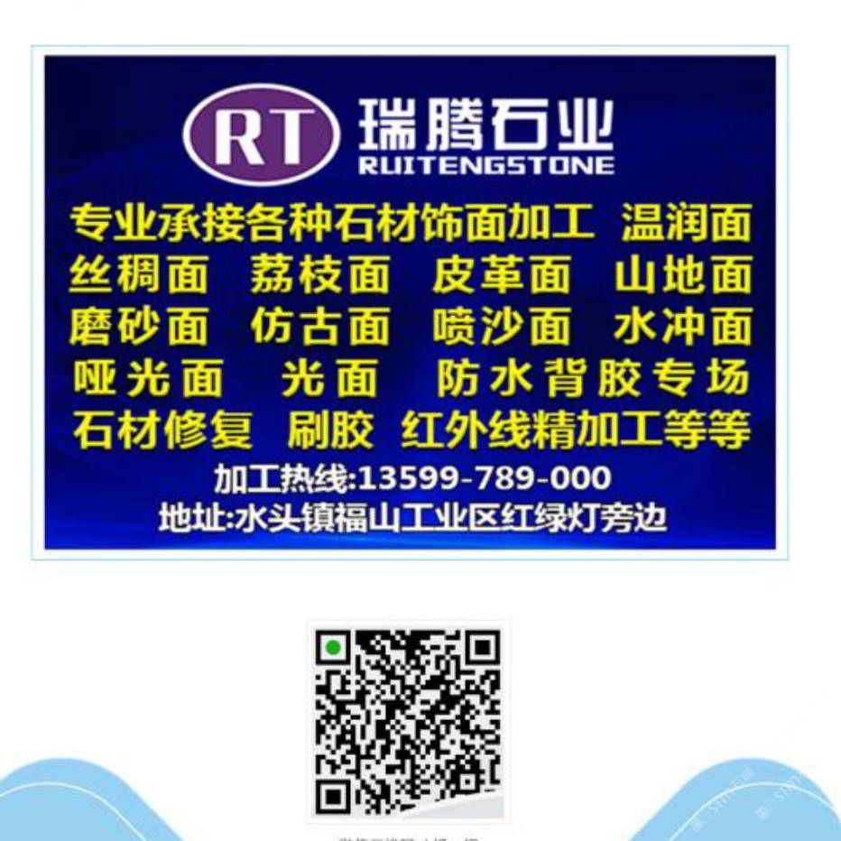 專業(yè)承接各種石材飾面加工,溫潤面,荔枝面,仿古面,剁斧面,啞光面,專業(yè)石材防水背膠等等,20頭靖佑自動磨對外加工,聯(lián)系電話13599789000
