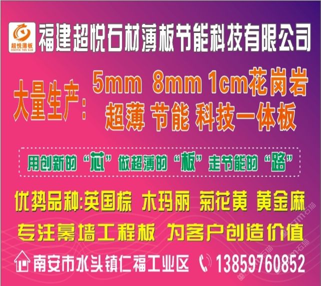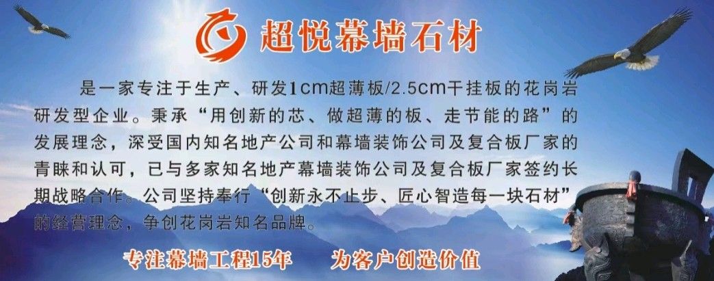 是一家專注于生產(chǎn)、研發(fā)1CM超薄板/2.5CM干掛板的花崗巖研發(fā)型企業(yè)。秉承“用創(chuàng)新的芯、做超薄的板、走節(jié)能的路”的發(fā)展理念,深受國內(nèi)知名地產(chǎn)公司和幕墻裝飾公司的青睞和認(rèn)可,已與多家知名地產(chǎn)幕墻裝飾公司簽約長期戰(zhàn)略合作。\\