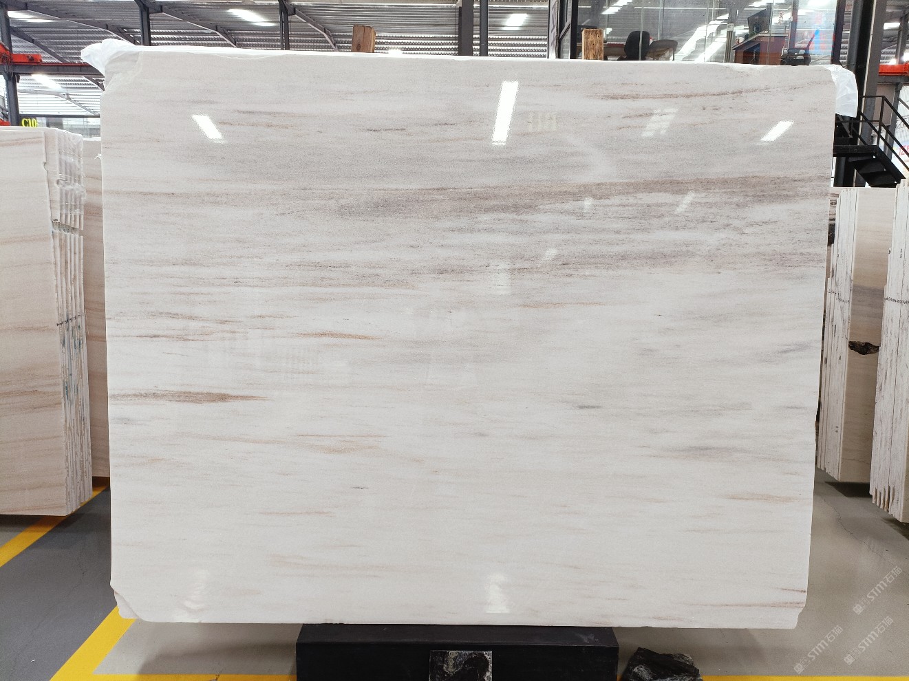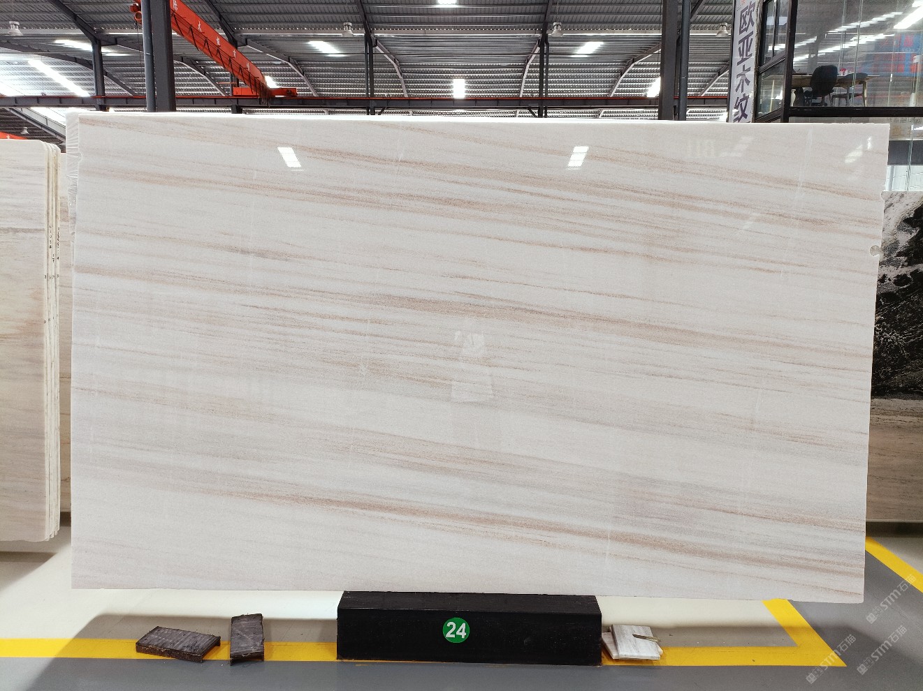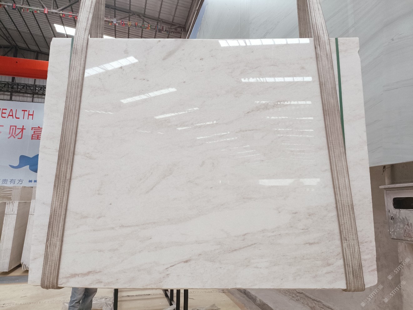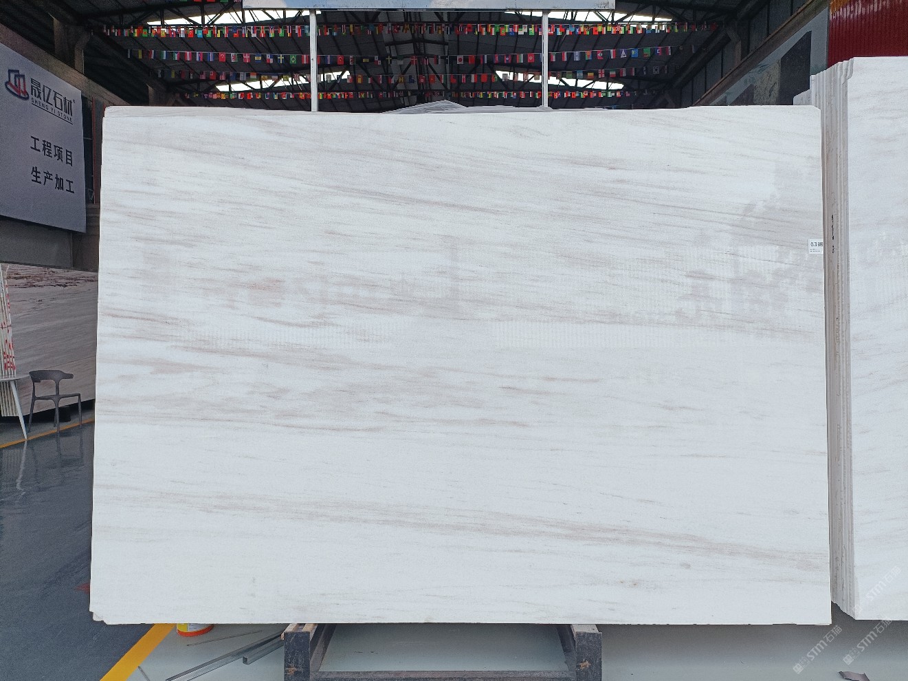 云浮站石材公司開發(fā)的歐亞白獨立礦山,專屬道路,礦口面積約 725 畝,證件齊全。今年礦口開采出直紋,亂紋優(yōu)質大板材料,礦山采用單面墻平臺開采方式,10臺繩鋸、5臺鏟車、5臺勾機、一臺 30 噸叉車,共有職工40人,已有兩個開采平臺。礦山已開采多年,道路、設施都已成熟,現產能穩(wěn)定增長。品質非常穩(wěn)定,一石兩面分別可以產出直紋和亂紋兩種紋路,材質為細膩的玉質品體。