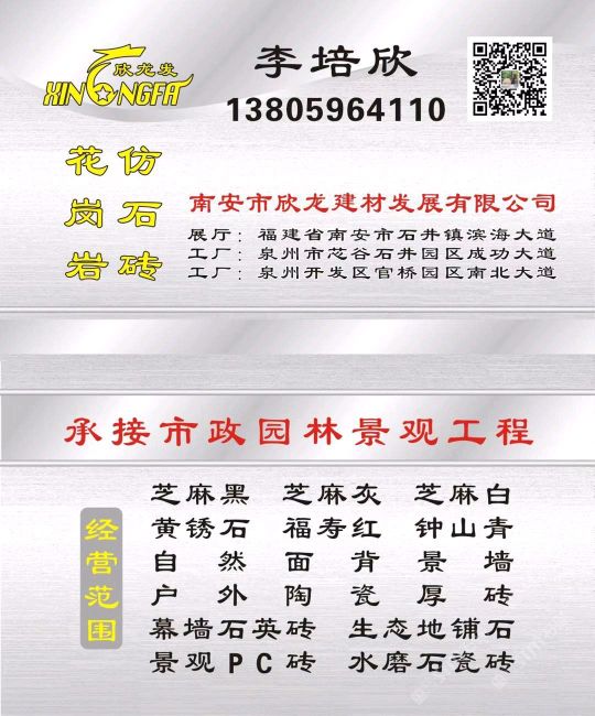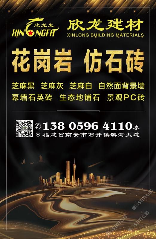 南安市欣龍建材發(fā)展有限公司,位于建材之鄉(xiāng)—福建省南安市石井鎮(zhèn),公司旗下?lián)碛袃纱笾髁Ξa(chǎn)品:花崗巖?仿石磚。(一)花崗巖:廠礦一體,荒料?大板?成品精加工,一站式供應(yīng)。擁有芝麻黑、芝麻灰、芝麻白、銹石、蝦紅、小藍(lán)寶、藍(lán)寶石、泉州紅、永定紅、福壽紅、福建青、鐘山青、喬治亞灰、G606、G617等品種,承接幕墻干掛、園林景觀、市政廣場、機(jī)場高鐵、別墅豪裝、酒店精裝、異形雕刻、自然面背景墻等工程。為石而生,匯聚石尚生活! (二)仿石磚:戶外陶瓷厚磚,接受客戶需求定制。不是石材,更勝石材!抗壓強(qiáng)度高、抗凍性能好、防滑耐磨、綠色環(huán)保。擁有幕墻石英磚、生態(tài)地鋪石、景觀PC磚、環(huán)保熔巖板、陶瓷透水磚、水泥PC磚等系列產(chǎn)品。采用先進(jìn)的技術(shù)與工藝,融匯東西方精粹,不斷創(chuàng)新,將不同文化風(fēng)尚及搭配方式重新組合設(shè)計(jì),開發(fā)現(xiàn)代新穎的產(chǎn)品,造就逼真無瑕的自然外觀質(zhì)感,滿足全球客戶不斷發(fā)展的個(gè)性化需求。產(chǎn)品廣泛應(yīng)用于園林小區(qū)、商業(yè)地產(chǎn)、公園廣場、市政道路、高鐵地鐵、酒店賓館、居家庭院、步行街、寫字樓、度假村、機(jī)場、學(xué)校、醫(yī)院、綠道等干掛鋪裝場所。因?yàn)閷W?,所以專業(yè)!