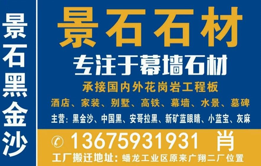 便宜黑金沙-景石石材肖總13675931931(微信同號(hào))專業(yè)黑金沙-安格拉黑-藍(lán)珍珠-綠星-藍(lán)鉆-藍(lán)眼睛-銀珠花崗巖供應(yīng)商,工廠位于南安水頭,配有八臺(tái)大切,4臺(tái)紅外線,6臺(tái)仿形機(jī)等設(shè)備;生產(chǎn)能力強(qiáng),管理規(guī)范,有實(shí)力承接中大型幕墻及園林景觀工程;追求更好的產(chǎn)品質(zhì)量是我們對(duì)客戶的宗旨;主營(yíng):印度黑金沙、安格拉黑、安哥拉黑、藍(lán)珍珠、銀珠、綠星、藍(lán)鉆、藍(lán)眼睛等石材;專注于幕墻干掛與水景工程,實(shí)力工廠,價(jià)格優(yōu)惠,真誠(chéng)希望您的光臨與合作!