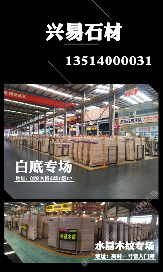 發(fā)布信息: ? ? ? 【興易大理石】 ? ? 白底水晶木紋專場 ? 我司主營水晶木紋系列產品: 水晶木紋,翡翠木紋,國產藍金沙,白金沙,彩虹木紋 ? 三萬平白底水晶木紋直紋新料任選, 條板,大板 荒料均有售,統(tǒng)一花色,防水背膠供應! 一片起售,白底特價板88起 我們專做!專注! 歡迎工程單合作 ? ?地址: ? 濱海高時物流一號館大門旁 ? 創(chuàng)安c區(qū)c7區(qū)興易石材 ? 電話:13514000031小李 ? ?