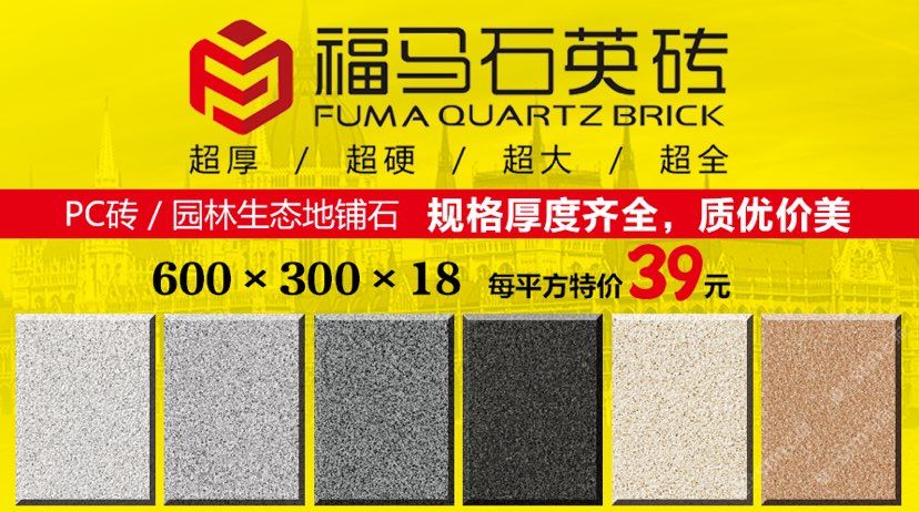 發(fā)布信息: ??福馬石英磚 ? 生態(tài)地鋪石創(chuàng)意源自于天然石材,品質(zhì)勝于天然石材。 以天然石粉、高嶺土、石英砂、長(zhǎng)石等原料,經(jīng)研磨、混合制漿、干燥噴粉、壓制、多層施釉、燒結(jié),1250℃高溫使原材料產(chǎn)生熔融狀態(tài),冷卻后重組結(jié)晶。這使得生態(tài)石更加密實(shí)和堅(jiān)硬。 ? 1、全瓷化通體材質(zhì),高瓷化度,低吸水率,使產(chǎn)品防滑、耐磨、高抗折、高耐污,清潔方便性。 ? 2、依據(jù)天然石材的表面,開(kāi)具特殊模具表面,使生態(tài)地鋪石具有石材質(zhì)感,仿真度更高,更防滑,不同于普通廣場(chǎng)磚 ? 3、產(chǎn)品表面經(jīng)7道以上特殊釉水工藝處理,使產(chǎn)品具有耐磨、防滑,高耐污,清潔方便的特點(diǎn)。 ? 4、產(chǎn)品顏色豐富(量大可定制),尺寸多樣。能夠配合設(shè)計(jì)師獨(dú)特創(chuàng)意,實(shí)現(xiàn)不同環(huán)境和個(gè)性所要求的裝飾風(fēng)格。 ? 5、耐久性好,適合場(chǎng)所廣。產(chǎn)品具有耐磨抗壓、防滑耐污、耐酸堿、抗凍、不褪色的特點(diǎn)。可用于大型貨車可通行的,市政工程,小區(qū)景觀路面,休閑廣場(chǎng),園林綠化,公園公共停車場(chǎng)等。 ? 6、后期養(yǎng)護(hù)、修補(bǔ)簡(jiǎn)單。產(chǎn)品顏色可控,不同批次產(chǎn)品色差控制在95%左右,且常規(guī)顏色產(chǎn)品,長(zhǎng)期備有庫(kù)存。