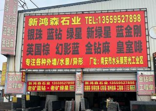新鴻森石業(yè)主營產(chǎn)品:綠星1,新綠星,藍(lán)珍珠,銀珠,幻影藍(lán),藍(lán)金剛1,七彩啡珠,皇室啡,英國棕(黑紅),安哥拉黑(黑水晶),金鉆麻(巴西),灰珍珠企業(yè)地址:福建南安建材市場40棟23號