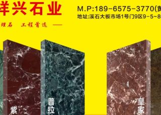祥興石業(yè)主營產(chǎn)品:深啡網(wǎng),紫羅紅,皇家紫檀1,大花綠,希臘大花綠,大花綠(印度),普拉達(dá)綠(希臘)企業(yè)地址:福建泉州水頭福山工業(yè)區(qū)溪石1號(hào)門9區(qū)祥興石業(yè)